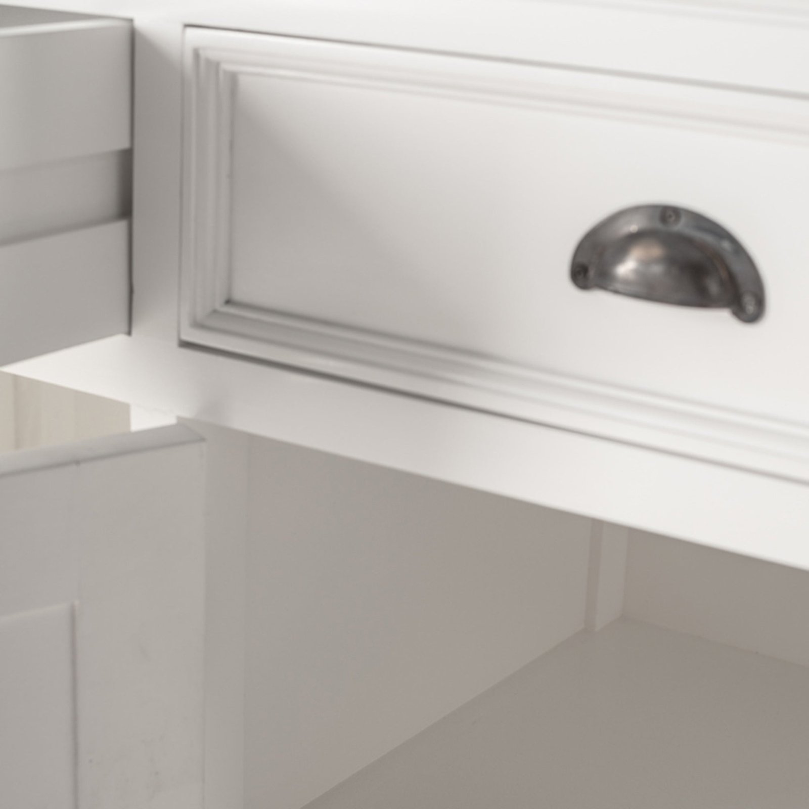 Add this buffet, full of modern charm, to your living room or dining room. It features ample storage and Antique Brass hardware, and its kiln-dried solid mahogany frame wears a Classic White finish. It is perfect to complement just about any other finish in the room. Inside, six internal shelves help you keep everything from dishes to linens organized with ease, while the four drawers on top are great for grab-and-go selections.